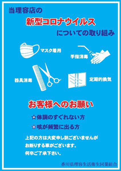 組合加盟店では、次亜塩素酸ナトリウム、マスク等を配布し、日々の必須事項、並びにチェック項目を作成し実践に努める様指導を徹底し、お客様への安全確保の為、香川県理容組合ではオリジナルのポップを作成し、店舗内に掲示するよう努めております。